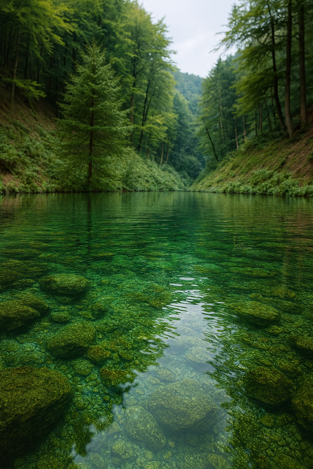 Ein See voller Forellen, umrahmt von Natur.